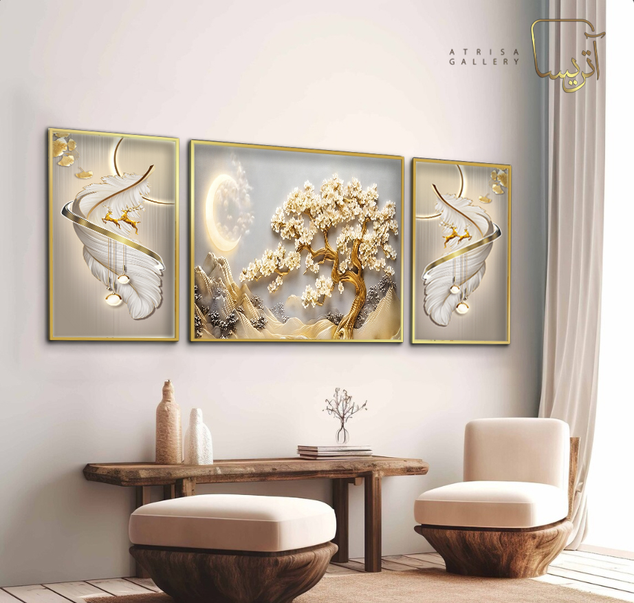 این ست شامل سه سایز 140*50 و 170*60 و 210*70 سانتی متر می باشد. سایز 140*50 شامل: یک عدد تابلوی 50*70 و دو عدد تابلوی 30*50 می باشد،که فضای اشغالی آن روی دیوار 140*50 سانتی متر می شود وهمچنین سایز 60*170 شامل: یک عدد تابلوی 60*80 و دو عدد تابلوی 40*60 می باشد،که فضای اشغالی آن روی دیوار 60*170 سانتی متر می شود وسایز 210*70 شامل :یک عدد تابلو 100*70 و دو عدد تابلوی 50*70 میباشد.